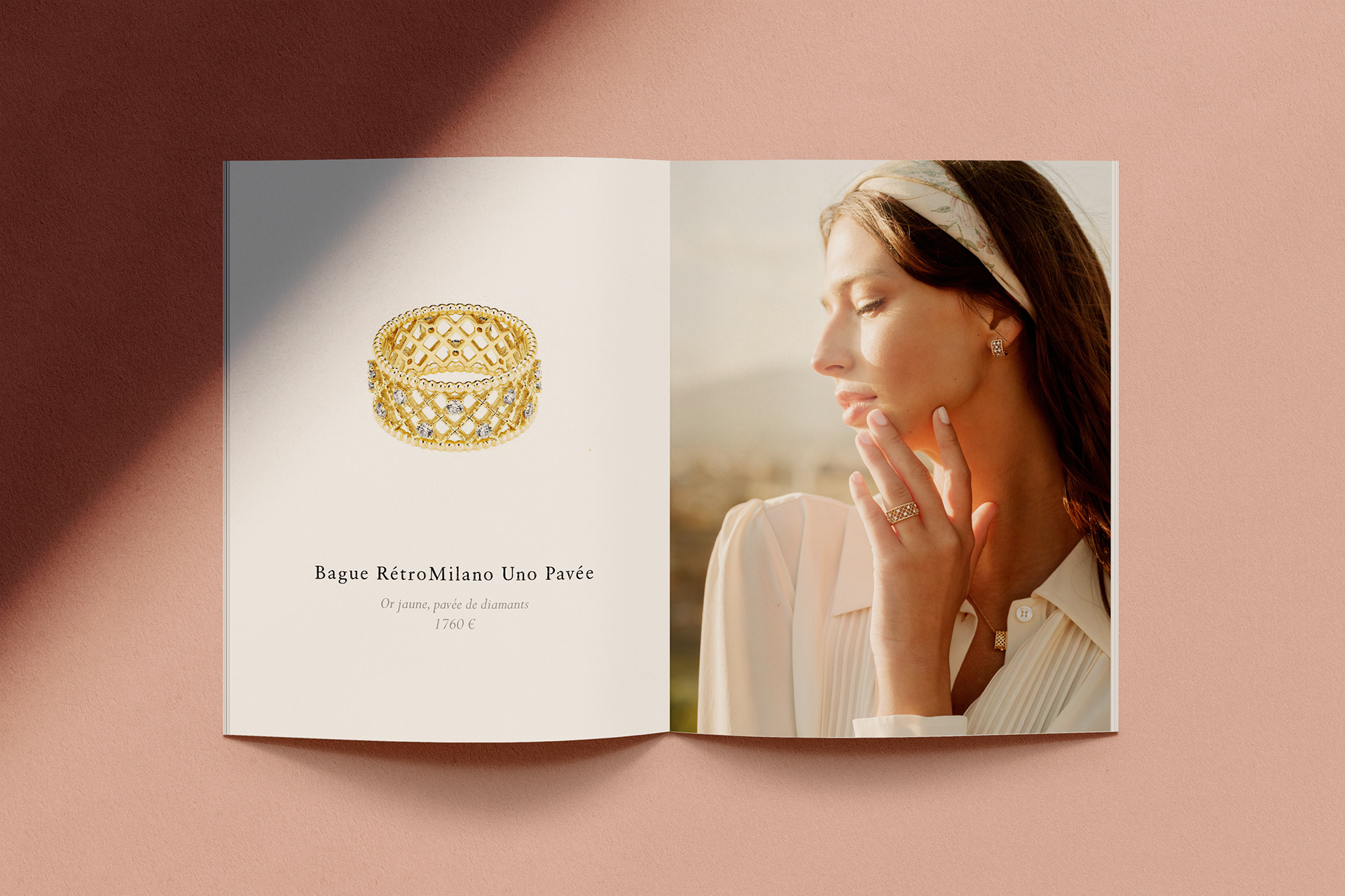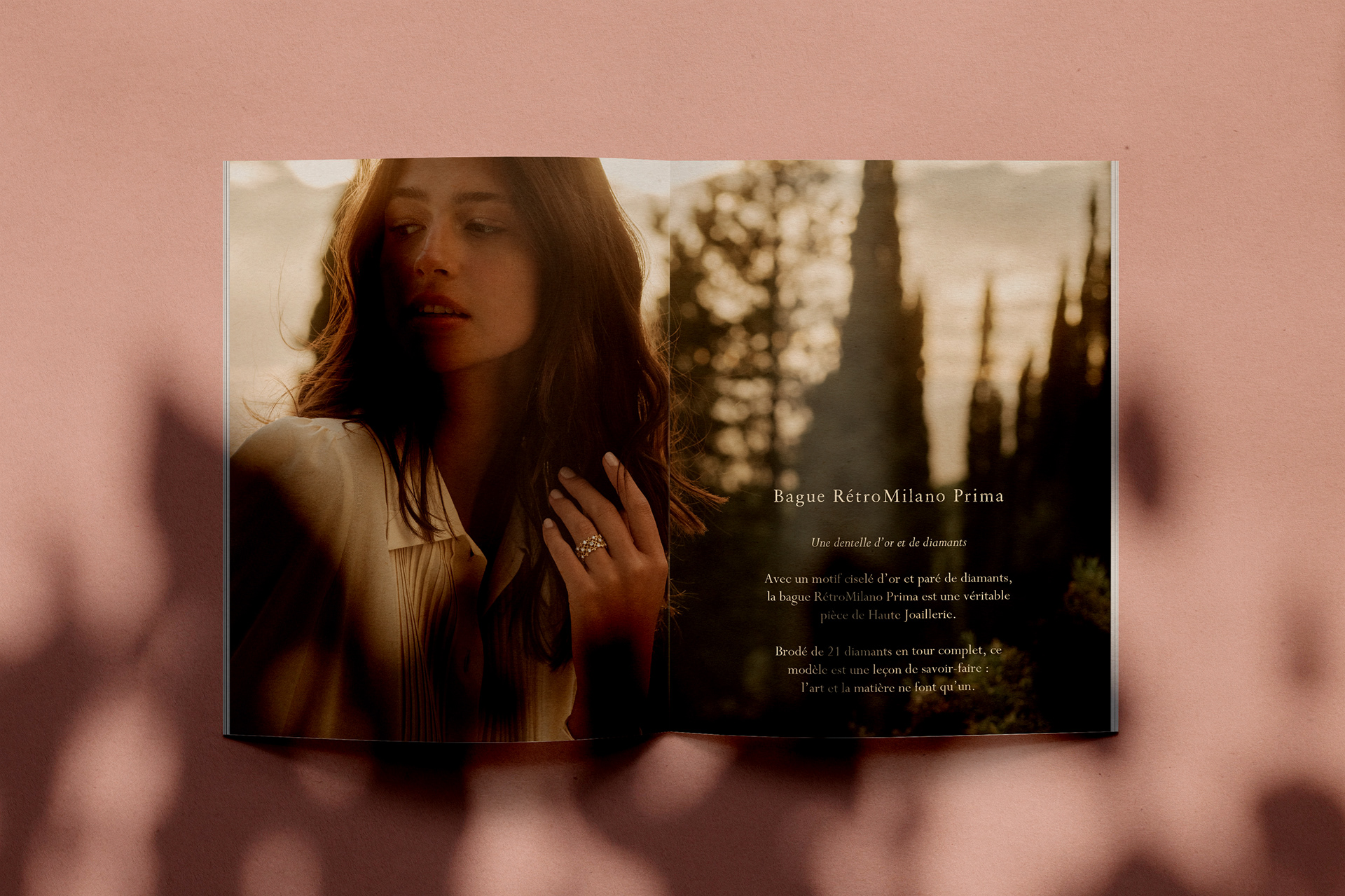Logotype et mise en page du lookbook de la collection RetroMilano de la maison de joaillerie Gemmyo.
